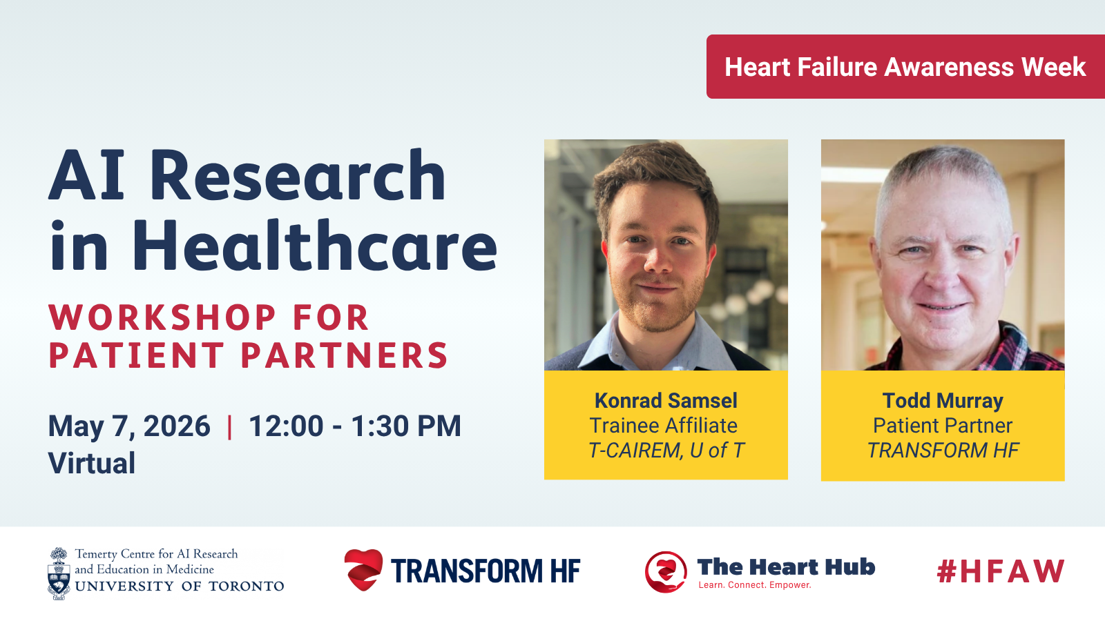 Delivered through a partnership between TRANSFORM HF, the Heart Hub, and T-CAIREM, this interactive session will explore why researchers use AI in healthcare, how these tools are applied, and where patient voices are essential in shaping responsible innovation.