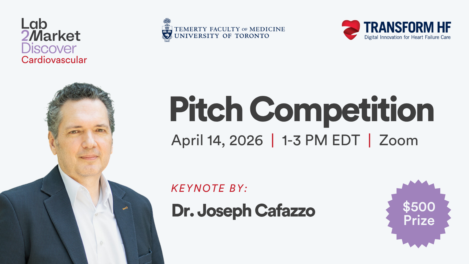 This event features the top pitches from the cohort, highlighting innovative solutions designed to transform the landscape of heart health. We are also honored to feature a keynote address by Dr. Joseph Cafazzo, a leading expert in the field, who will share insights on the future of innovation in cardiovascular care.